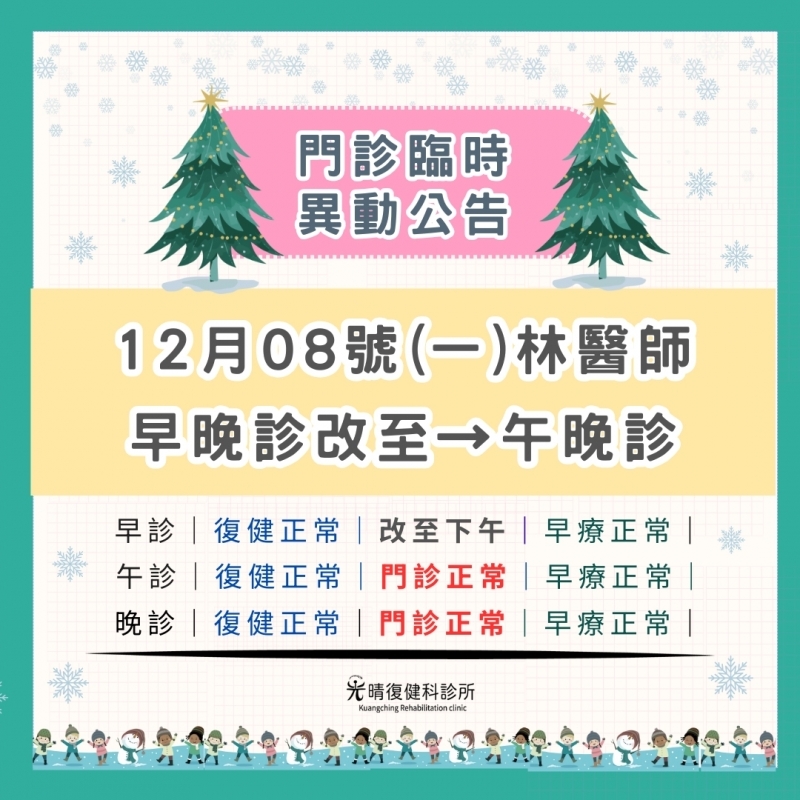 下週一林醫師門診異動 12/08 (週一)由早午診→更改至午晚診