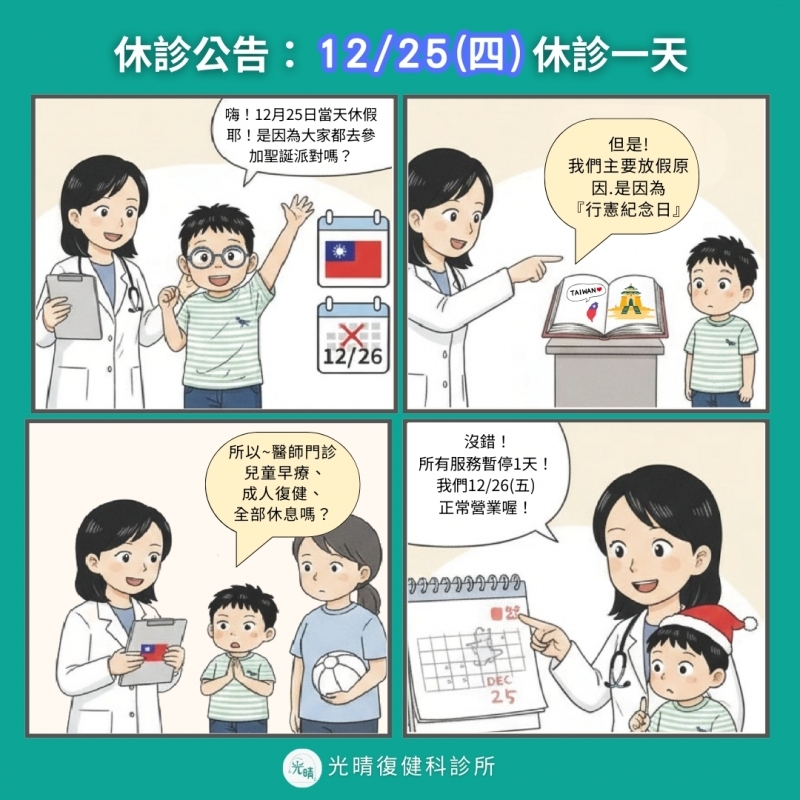 本院將於 12/25(四 ) 休診一天 ( 早療復健同步休息)
